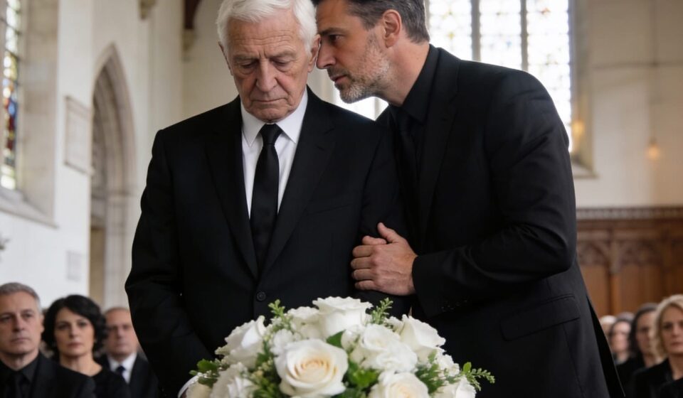 He stood near the front, perfectly composed, dressed in an expensive black suit, accepting condolences like a man performing a role.