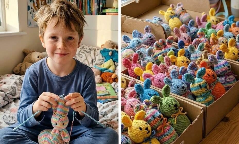 My grandson Liam has lived with me and his father ever since his mother, Emily, passed away two years ago. After that loss, he became quieter, more withdrawn, and less like the bright, playful boy he used to be. The one thing he held onto was a box of Emily’s handmade sweaters, each one tied to memories he couldn’t quite put into words. Then, one afternoon before Easter, he came into the kitchen holding a tiny knitted bunny he had made himself. He explained that he wanted to give bunnies to children in the hospital so they wouldn’t feel lonely. From that day on, he worked steadily, unraveling his mother’s sweaters into yarn and turning them into one hundred handmade bunnies, each one carrying a small note of encouragement.
