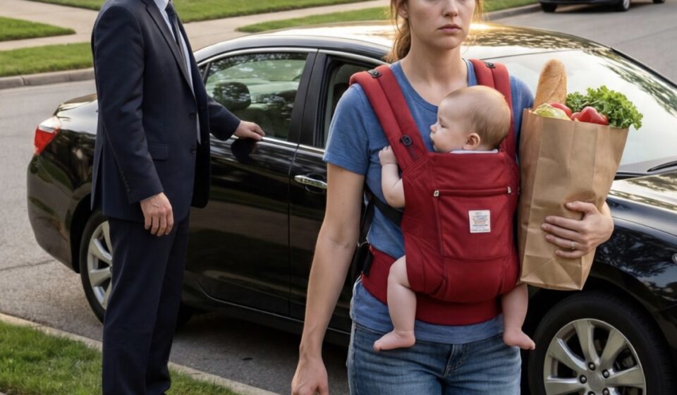 Emily Carter limped slowly along the sidewalk, her baby balanced on one hip, a heavy grocery bag cutting into her palm.